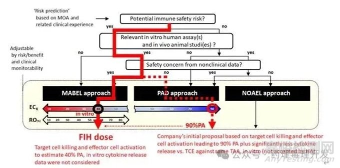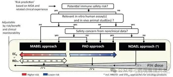 文中修訂了免疫調(diào)劑FIH起始劑量計(jì)算的決策樹。該修訂版決策樹的主要流程與Leach等人提出的框架一致,采用三級(jí)體系:1)基于作用機(jī)制、靶點(diǎn)藥理學(xué)和/或臨床經(jīng)驗(yàn)的安全性風(fēng)險(xiǎn);2)體外人體實(shí)驗(yàn)和/或毒理學(xué)動(dòng)物模型的相關(guān)性;3)基于非臨床毒理學(xué)研究的臨床安全性風(fēng)險(xiǎn)。如下圖所示。對(duì)于MABEL和PAD途徑,比較容易理解,不再贅述,根據(jù)風(fēng)險(xiǎn)級(jí)別,選擇合適的RO值和ECx即可。對(duì)于安全性風(fēng)險(xiǎn)較低的低毒性分子,傳統(tǒng)的NOAEL,HNSTD/STD10(腫瘤藥物)也可以作為計(jì)算依據(jù)之一。