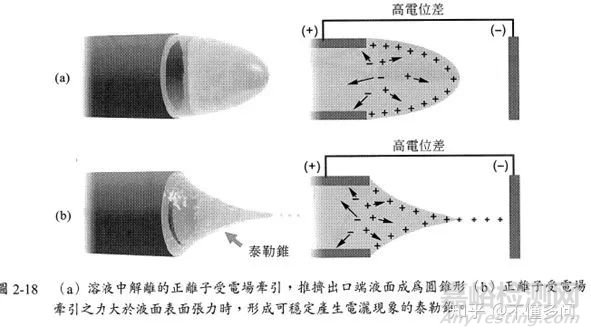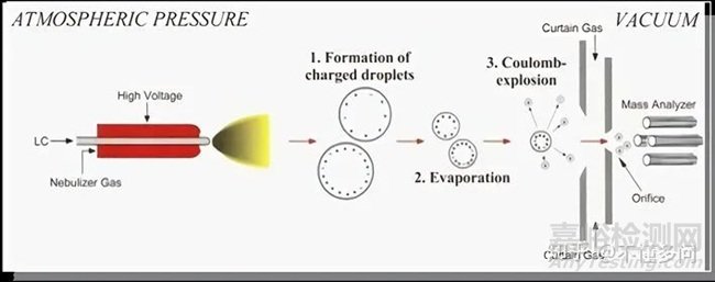 如圖2-18 液態(tài)樣品在毛細(xì)管噴針處經(jīng)電場帶電后,液滴在電場力的作用下形成泰勒錐并在尖端形成一系列微小的帶點(diǎn)液滴,這些帶點(diǎn)液滴在離子源處受到輔助加熱氣(氮?dú)猓┑淖饔孟驴焖僬舭l(fā),由于溶劑大量蒸發(fā),原本小的帶電液滴表面積聚大量的帶電電荷發(fā)生庫倫爆炸的過程(見下圖),最終形成氣相的帶電分子離子進(jìn)入質(zhì)譜。