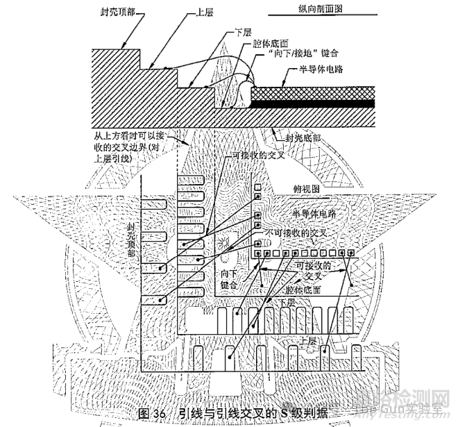 條件A(S級):引線與引線交叉(公共導(dǎo)線除外)。但對多層封裝發(fā)生在較低層引線鍵合層的邊界之內(nèi)或向下鍵合的封裝內(nèi),而且它們之間的最小間隙應(yīng)為引直徑的兩倍以上,這種引線交叉是可接收的(見下圖)。引線不能與1根以上的其他引線交叉;不允許多于4根交叉引線或交叉引線數(shù)量多于引線總數(shù)的10%,對任何單獨封裝腔體取其大者。