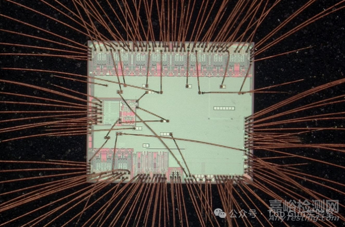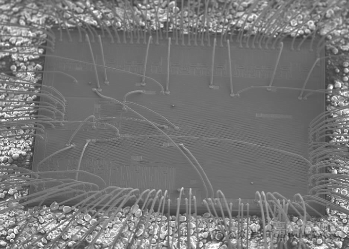 從上述國軍標要求可知,芯片是不允許引線和因此案交叉的,除非是相同功能或者有高低錯落層次的鍵合打線。但是在商用芯片中,這種交叉打線(單層封裝)是非常常見的(如下圖所示)。