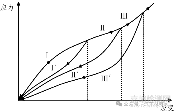 在重復(fù)受載條件下,橡膠會(huì)發(fā)生應(yīng)力軟化,可將這一現(xiàn)象表述為如圖1所示的Mullins效應(yīng)。當(dāng)橡膠在卸載或施加的載荷小于第一次時(shí),其應(yīng)力應(yīng)變路徑都位于加載路徑之下。當(dāng)再次加載的載荷大于第一次時(shí),加載曲線先沿著第一次的卸載路徑Ⅰ′和路徑Ⅱ上升,隨后沿著路徑Ⅱ′卸載,后續(xù)的加卸載過程與上述情況相同[13]。