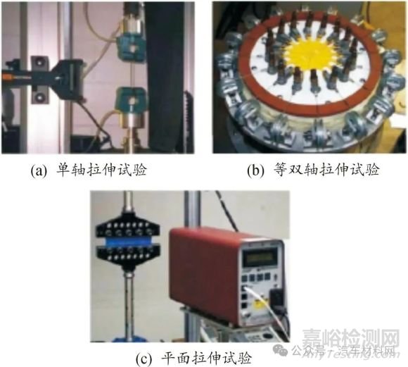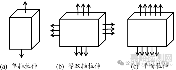 橡膠的本構(gòu)關(guān)系試驗(yàn)指單軸拉伸、等雙軸拉伸和平面拉伸3種[54],如圖6所示,分別表征橡膠在3種不同狀態(tài)下的力學(xué)行為,通常情況下,橡膠材料受到外加載荷而產(chǎn)生的形變都能由這3種變形的耦合狀態(tài)進(jìn)行表征。