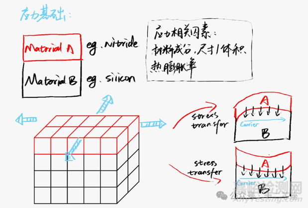 由于材料A與B在組分成分、原子/分子尺寸(體積)及熱膨脹系數(shù)上的不匹配,A會(huì)對(duì)B施加機(jī)械應(yīng)力。