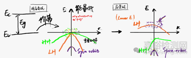 HH/LH簡(jiǎn)并解除,LH帶上移,HH帶下移,能帶分裂帶來更少的載流子散射,從而得到更高的遷移率。