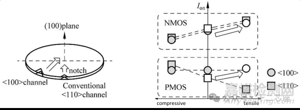 這也是未采用應(yīng)變技術(shù)時(shí),業(yè)界選擇(100)晶圓上<100>溝道設(shè)計(jì)PMOS的原因。而后為實(shí)現(xiàn)應(yīng)變工程增益,PMOS須制備于<110>溝道并施加壓應(yīng)力。