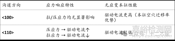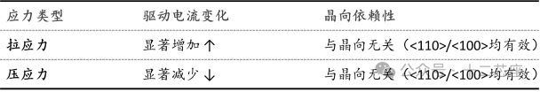 <110>和<100>溝道:拉應(yīng)力均使驅(qū)動(dòng)電流增大,壓應(yīng)力則使其減小。