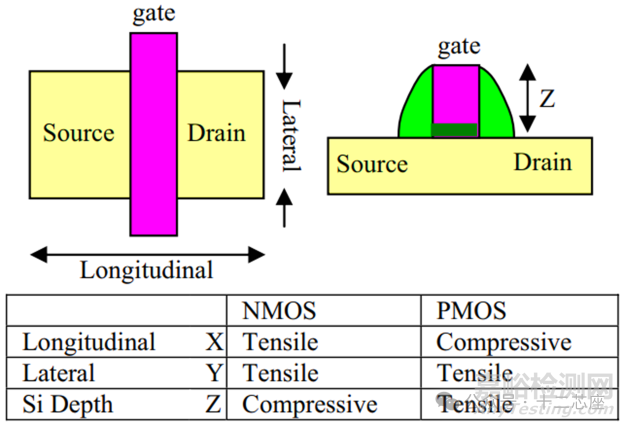 由上文可知應(yīng)力破壞了晶體對(duì)稱性,分別消除了價(jià)帶的2重簡(jiǎn)并性和導(dǎo)帶的6重簡(jiǎn)并性。這將導(dǎo)致能帶散射率和或載流子有效質(zhì)量發(fā)生變化,進(jìn)而影響載流子遷移率。然而,NMOS和PMOS載流子在三個(gè)方向即縱向(longitudinal)、橫向(lateral)和硅深度方向(Si depth directions)上與溝道應(yīng)變的相互作用不同。Fig7. 展示了單軸應(yīng)力的可能方向及NMOS/PMOS 性能提升所期望得到的力。