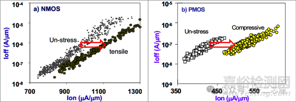 NMOS電流在通道中施加拉應(yīng)力時(shí)增強(qiáng),而PMOS電流在施加壓應(yīng)力時(shí)增強(qiáng)。Ion/Ioff 提升如Fig8. 所示。
