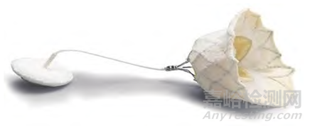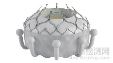 雖然從臨床應(yīng)用來看,經(jīng)導管二尖瓣修復產(chǎn)品表現(xiàn)出較好的可行性和安全性,但其適應(yīng)證相對有限,且術(shù)后仍無法完全抑制二尖瓣反流的發(fā)生[19]。經(jīng)導管二尖瓣置換產(chǎn)品可用于不適合接受修復手段治療的二尖瓣反流患者,作為經(jīng)導管二尖瓣修復產(chǎn)品的補充。二尖瓣具有復雜的結(jié)構(gòu)和D形瓣環(huán),這給人工瓣膜的錨定和密封帶來了極大的挑戰(zhàn)[20]。目前經(jīng)導管二尖瓣置換產(chǎn)品的錨定可分為尾部系繩、徑向過盈、倒刺、錨定臂、環(huán)中瓣等方式[21]。Tendyne瓣膜系統(tǒng)(雅培醫(yī)療)是全球首個獲批上市的經(jīng)導管二尖瓣置換產(chǎn)品,其瓣膜主體(見圖2)為雙框架結(jié)構(gòu),外框架輪廓與二尖瓣環(huán)的形狀匹配,內(nèi)框架為圓形結(jié)構(gòu),瓣葉由三片豬心包材料制成,尾部用系繩連接一個墊片,墊片固定于心尖外側(cè),通過調(diào)整系繩的松緊度防止瓣膜主體移位,避免發(fā)生瓣周漏[22]。