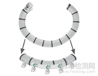 三尖瓣的瓣葉對合緣修復與二尖瓣緣對緣修復類似,瓣膜夾分別捕獲三尖瓣的兩個瓣葉,再將瓣膜夾閉合后釋放[26]。三尖瓣夾與二尖瓣夾的結(jié)構(gòu)類似,為適應(yīng)三尖瓣的解剖位置和結(jié)構(gòu),三尖瓣夾輸送系統(tǒng)的頭端導管可彎曲度更高。TriClip系統(tǒng)(雅培醫(yī)療)在MitraClip系統(tǒng)的基礎(chǔ)上改進了輸送裝置,使其更適合在右心部位操作[27],該產(chǎn)品于2020年獲得CE認證,2024年2月獲得美國食品和藥品管理局(Food and Drug Administration, FDA)批準上市。PASCAL系統(tǒng)(愛德華醫(yī)療)于2020年獲得CE認證用于三尖瓣介入治療[28]。三尖瓣瓣環(huán)成形產(chǎn)品在錨定時需要在原生三尖瓣環(huán)上打孔和穿孔,存在損傷右冠狀動脈的可能性,對手術(shù)操作和器械的可靠性要求較高。Cardioband系統(tǒng)[29](愛德華醫(yī)療)使用螺旋形錨定器實現(xiàn)瓣環(huán)(見圖3)固定,將滌綸帶固定在原位瓣環(huán)偏外側(cè)的位置。Pasta系統(tǒng)采用跨瓣環(huán)的雙孔修復技術(shù),將兩根縫合線和小墊片依次植入三尖瓣瓣環(huán)中前部與后間隔處,通過收緊縫合線,形成雙孔形三尖瓣。該產(chǎn)品的臨床研究結(jié)果[30]顯示,雙孔修復可以減輕三尖瓣反流,但該方法可能會對三尖瓣環(huán)產(chǎn)生過大的牽拉力而導致治療失敗。經(jīng)導管三尖瓣置換相對于修復手段來說,行消除術(shù)后反流的效果較好。Evoque瓣膜(見圖4)系統(tǒng)(愛德華醫(yī)療)是全球首個獲批上市的經(jīng)導管三尖瓣置換產(chǎn)品,其依靠外側(cè)9個夾持體鉤住原生瓣葉,夾持體與瓣膜支架主體之間形成夾持力夾住瓣葉,達到固定瓣膜的效果[31]。該產(chǎn)品于2023年獲得CE認證,2024年獲得FDA批準上市。對于瓣膜修復失敗或原生瓣環(huán)直徑過大的患者,還可以通過三尖瓣異位置換進行治療。該方法將經(jīng)導管瓣膜支架系統(tǒng)置入上腔靜脈和下腔靜脈中,從而防止心房血液反流入腔靜脈所導致的體循環(huán)淤血及對全身臟器造成的損傷,最終減輕右心衰竭癥狀[32]。目前,三尖瓣疾病介入治療的短期效果和長期效果的預測因素仍不明確[33],三尖瓣介入治療的臨床證據(jù)還有待完善。