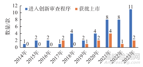圖5 2014—2023年進入創(chuàng)新審查程序和獲批上市的心臟瓣膜介入創(chuàng)新產(chǎn)品數(shù)量