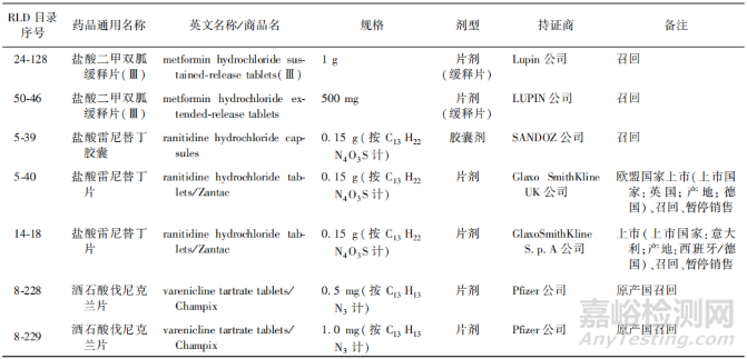 RLD的可及性也會(huì)受到某些突發(fā)事件的影響,如亞硝胺類雜質(zhì)事件。2018年6月,某些藥品被報(bào)道可能出現(xiàn)亞硝胺類雜質(zhì),受到影響的品種共有5類:沙坦類、含二甲雙胍類、雷尼替丁類、利福平類和酒石酸伐尼克蘭片[14]。美國(guó)FDA和歐洲EMA均采取了相應(yīng)的控制策略,受到影響的品種可能面臨召回或撤市的風(fēng)險(xiǎn),從而在一定程度上影響了我國(guó)RLD的可及性。我國(guó)RLD目錄中可能受影響的品種匯總見表7。