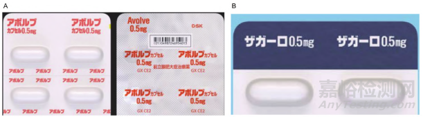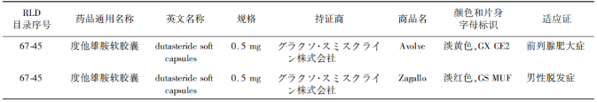 我國(guó)RLD目錄中收錄的品種,每1個(gè)條目序號(hào)對(duì)應(yīng)1種規(guī)格的RLD,有助于企業(yè)準(zhǔn)確查找對(duì)應(yīng)的RLD。但對(duì)于某些原研產(chǎn)品,上市后可能會(huì)開發(fā)新的臨床適應(yīng)證,從而導(dǎo)致新的制劑品種批準(zhǔn)上市,如果2個(gè)品種在工藝處方上有所差別,則視為不同的品種。例如,我國(guó)RLD目錄中序號(hào)為67?45的度他雄胺軟膠囊(0.5mg),持證商為葛蘭素·史克株式會(huì)社(グラクソ·スミスクライン株式會(huì)社),但是該持證商對(duì)于這一規(guī)格擁有2種產(chǎn)品,商品名、處方工藝、產(chǎn)品包裝和臨床適應(yīng)證均有所差異(見表2和圖1),不利于企業(yè)選擇合適的RLD。
