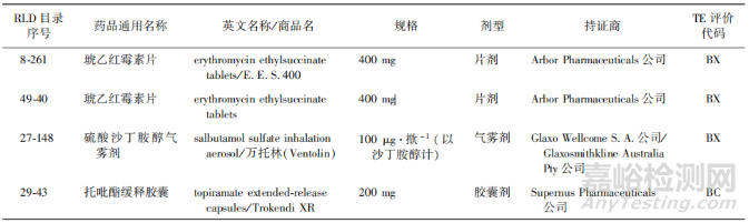 美國(guó)橙皮書中的多源性處方藥會(huì)被分配相應(yīng)的TE評(píng)價(jià)代碼作為臨床藥品選擇的公共信息[4]。TE代碼具有2種基本類型,分別用首字母A和B表示,以區(qū)別不同的TE類別。首字母A表示美國(guó)FDA認(rèn)為該產(chǎn)品與其他藥學(xué)等效的產(chǎn)品治療等效,如果不存在已知或可疑的生物等效性問題,根據(jù)劑型的不同,分別被指定為AA,AN,AO,AP或AT等;如果存在實(shí)際或可能的生物等效性問題,但已經(jīng)被充分的體內(nèi)(in vivo)或體外(in vitro)研究證明生物等效,則被指定為AB。首字母B表示美國(guó)FDA認(rèn)為該產(chǎn)品與其他藥學(xué)等效的產(chǎn)品并非治療等效,這些產(chǎn)品一般存在實(shí)際或可能的生物等效性問題,尚未經(jīng)充分研究證明生物等效,根據(jù)劑型的不同,分別被指定為BC,BD,BE,BN,BP,BR,BS,BT,BX或B∗等。我國(guó)在遴選RLD時(shí),并未要求對(duì)TE評(píng)價(jià)代碼進(jìn)行考察。因此,目錄中某些RLD的代碼為B,可能影響生物等效性臨床試驗(yàn)的成功率,引發(fā)仿制藥開發(fā)的風(fēng)險(xiǎn)。我國(guó)RLD目錄中部分TE評(píng)價(jià)代碼為B的品種見表4。