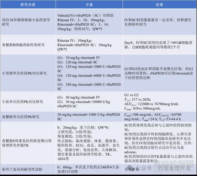 為支持Rituxan Hylecta上市,額外開(kāi)展了非臨床藥理學(xué)、藥代動(dòng)力學(xué)和毒理學(xué)研究,同時(shí)橋接已上市Hylenex、Rituxan兩個(gè)個(gè)產(chǎn)品的資料。Rituxan Hylecta應(yīng)該是首個(gè)含透明質(zhì)酸酶的共制劑產(chǎn)品,圍繞透明質(zhì)酸酶和Rituxan+透明質(zhì)酸酶共制劑開(kāi)展了大量藥理毒理研究。篇幅所限,透明質(zhì)酸酶相關(guān)研究暫且不表,重點(diǎn)看下圍繞Rituxan Hylecta整體制劑開(kāi)展了哪些非臨床研究。主要包括2項(xiàng)主要藥效學(xué)研究,3項(xiàng)藥代動(dòng)力學(xué)研究和2項(xiàng)毒理學(xué)研究。