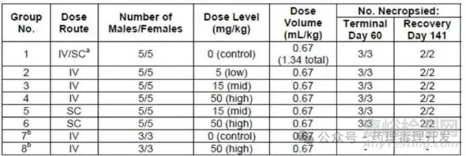 支持皮下制劑上市的藥理毒理研究中,未開(kāi)展藥理學(xué)研究,而是參考的靜脈給藥制劑的上市資料。靜脈制劑僅采用替代抗體開(kāi)展了腹腔注射給藥的抗腫瘤藥效學(xué)研究。FDA接受不需要額外開(kāi)展皮下制劑的藥理學(xué)研究。同樣的,皮下制劑也未額外開(kāi)展非臨床ADME/PK研究。當(dāng)然,也未開(kāi)展遺傳毒性、生殖毒和致癌性試驗(yàn)。僅開(kāi)展了一般毒理研究。不過(guò),這項(xiàng)毒理研究并不是專為皮下制劑而設(shè)立。實(shí)際上是在開(kāi)發(fā)靜脈給藥制劑時(shí)開(kāi)展的食蟹猴重復(fù)給藥毒理研究中,帶上了兩組皮下給藥,如下表所示。結(jié)果證明,本品皮下和靜脈給藥毒性學(xué)研究結(jié)果相似。FDA接受這一毒理學(xué)設(shè)計(jì)和結(jié)果。