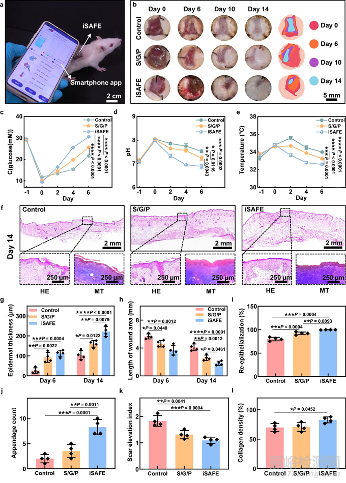 圖片說(shuō)明:與對(duì)照組(Control)和僅使用材料組(S/G/P)相比,iSAFE組在14天內(nèi)實(shí)現(xiàn)了近乎完全的愈合。