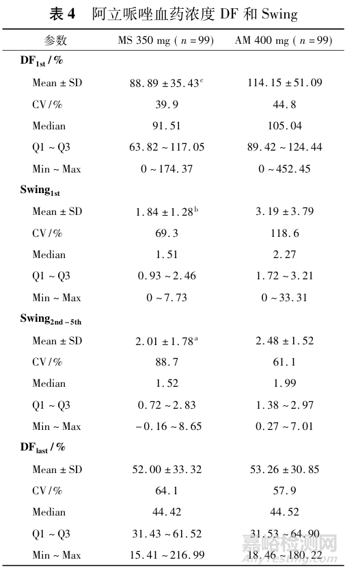 對最后一次注射進行了類似的DF和Swing計算。對于第2~5次給藥,由于稀疏采樣無法計算阿立哌唑的平均濃度,僅計算Swing。