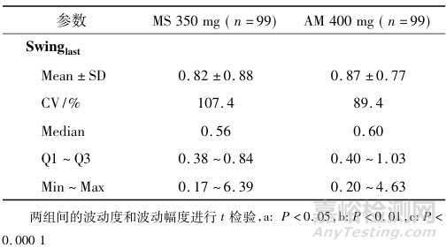 MS350mg組首次給藥后DF為(88.89±35.43)%,Swing為(1.84±1.28),末次給藥后穩(wěn)態(tài)DF為(52.00±33.32)%,Swing為(0.82±0.88)。而AM400mg組的首次的波動度和波動幅度為(114.15±51.09)%和(3.19±3.79),末次給藥的DF和Swing分別為(53.26±30.85)%和(0.87±0.77),見表4。MS350mg組在前4次給藥期間的血藥濃度波動均低于AM 400mg組,最后一次給藥后兩組達到穩(wěn)態(tài),血藥濃度波動接近。