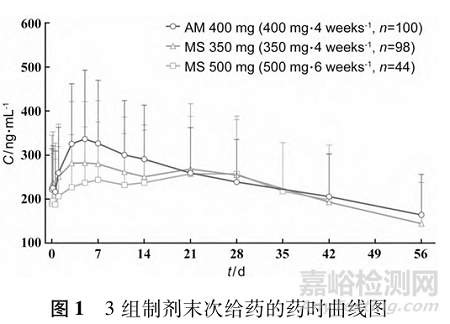 MS350mg組患者與對照AM 400mg組每4周接受1次肌內(nèi)注射,即在d1,d29,d57,d85和d113共接受5次肌內(nèi)注射。MS500mg組每6周接受1次肌內(nèi)注射,分別于d1,d43,d85,d127共接受4次肌內(nèi)注射。MS 350mg和AM 400mg組采集29個時間點的血樣,分別為: 第1次注射(d1)的給藥前1h、給藥后4h,12h,d2,d4,d6,d8,d12,d15,d22; 第2~4次注射(d29,d57,d85)分別在給藥前1h內(nèi)和給藥后d14采集血樣; 第5次注射(d113)的給藥前1h、給藥后4h,12h,d2,d4,d6,d8,d12,d15,d22,d29,d43,d57采集血樣。MS 500mg組采集31個時間點的血樣,分別為: 第1次注射(d1)的給藥前1h、給藥后4h,12h,d2,d4,d6,d8,d12,d15,d22,d29,d36; 第2~3次注射(d43,85)分別于給藥前1h內(nèi)、給藥后d14,d28采集靜脈血; 第4次注射(d127)給藥前1h,給藥后4h,12h,d2,d4,d6,d8,d12,d15,d22,d29,d36,d43采集血樣。