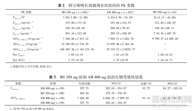 結(jié)果: MS 350mg制劑與AM 400mg制劑具有生物等效性。兩組在第1次注射后第12周、第20周和第24周的PANSS評分均較基線顯著降低,組間無顯著差異。MS 350mg組血藥濃度波動程度較低,表明其藥物暴露譜更為穩(wěn)定。MS350mg組的TEAEs(75.7% vs 54.4%)及ADRs(83.5% vs 62.1%)發(fā)生率均低于AM 400mg組。
