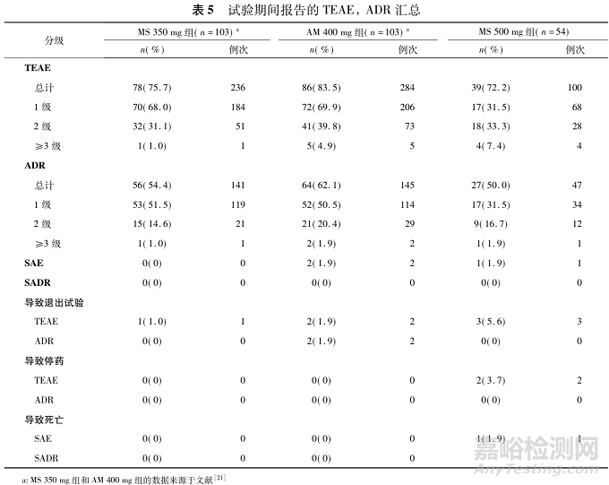 在ITT人群中,MS 350mg組和MS 500mg組治療出現(xiàn)的不良事件(treatment-emergent adverse events,TEAEs)和藥物不良反應(yīng)(adverse drug reactions,ADRs)的發(fā)生率低于AM 400mg組(75.7%和72.2%vs83.5%,54.4%和50.0%vs62.1%)。值得注意的是,大多數(shù)TEAEs的嚴(yán)重程度為1~2級,在MS350mg組和AM 400mg組中,3級及以上的TEAEs發(fā)生率分別為1.0%和4.9%,MS500mg組為7.4%。MS 350mg組、MS 500mg組和AM4 00mg組因TEAEs導(dǎo)致退出研究的發(fā)生率分別為1.0%,5.6%和1.9%。