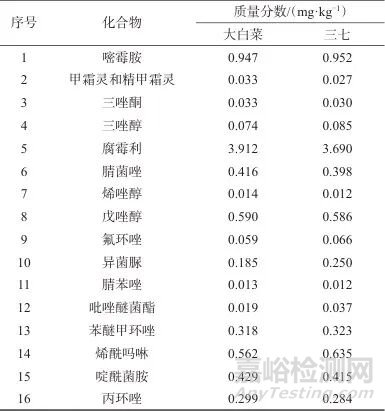 2.2 基質(zhì)效應(yīng)評(píng)價(jià)(白菜基質(zhì)與三七基質(zhì)結(jié)果比較)