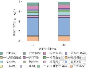 通過查詢文獻(xiàn)[2,5-9,13],目前用氣相色譜-質(zhì)譜法測(cè)定多種農(nóng)藥殘留的方法運(yùn)行時(shí)間都在20 min以上,大多數(shù)采用的是DB-5MS/HP-5MS毛細(xì)管色譜柱(30 m×0.25 mm,0.25 μm) 20 min以上程序升溫。為了驗(yàn)證方法的準(zhǔn)確性和適用性,將兩根色譜柱的測(cè)定結(jié)果進(jìn)行了比較,經(jīng)t檢驗(yàn),無顯著性差異,從圖2、圖3的帶狀可以很形象地體現(xiàn)出來。