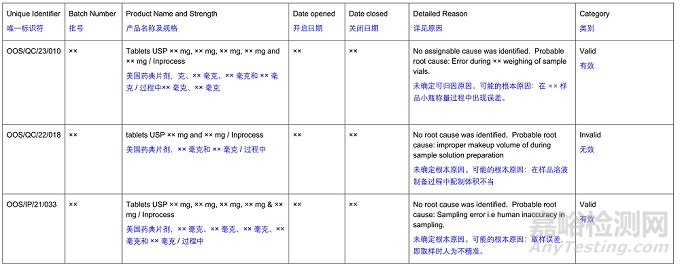 用于 ×× 毫克、×× 毫克、×× 毫克和 ×× 毫克的USP ×× 片劑 / 過程中的 ×× 檢測方案,指導(dǎo)質(zhì)量保證(QA)人員收集成品的單個(gè)劑型。對于批號為 ×× 的 ×× 毫克的USP ×× 片劑,根據(jù) QA 為確定上下限可采集的樣品量范圍,這相當(dāng)于樣品量規(guī)格為:×× 毫克至 ×× 毫克。據(jù)助理 QA 經(jīng)理稱,沒有可用于 ×× 檢測的研究。此外,自 2021 年 6 月以來報(bào)告了以下超出規(guī)格(OOS)的結(jié)果,這些結(jié)果被歸因于可能的取樣誤差: