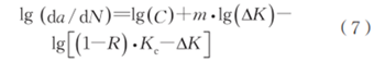 不大于10−7~10−6mm/ 周次的da/dN-ΔK數(shù)據(jù),按式(1)進(jìn)行最佳擬合。