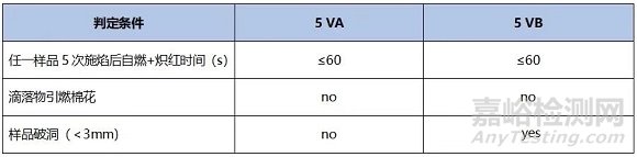 5VB:對(duì)樣品進(jìn)行五次5秒的燃燒測(cè)試后,余焰&余燃在60 秒內(nèi)熄滅。滴落的微粒不可點(diǎn)燃棉花。對(duì)于塊狀樣品允許被燒穿。