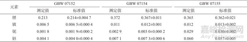 按照所建方法測(cè)定標(biāo)準(zhǔn)物質(zhì)GBW 07152、GBW 07154和GBW 07155,結(jié)果見表10。由表10可知,鋰、鈹、鈮、鉭的測(cè)定結(jié)果均處于標(biāo)準(zhǔn)值不確定度范圍內(nèi),表明該方法準(zhǔn)確度較高,可以滿足稀有金屬鈮鉭礦中鋰、鈹、鈮、鉭4種元素的檢測(cè)要求。