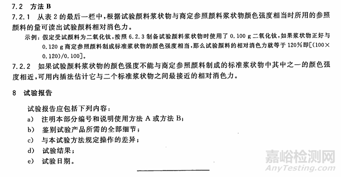 標(biāo)準(zhǔn)中描述了兩個(gè)方法(A和B),均為目視比較法。方法A比方法B快,適合單個(gè)顏料樣品的試驗(yàn);對(duì)于多個(gè)樣品的試驗(yàn),方法B更好些,特別是對(duì)于未知消色力的顏料樣品。