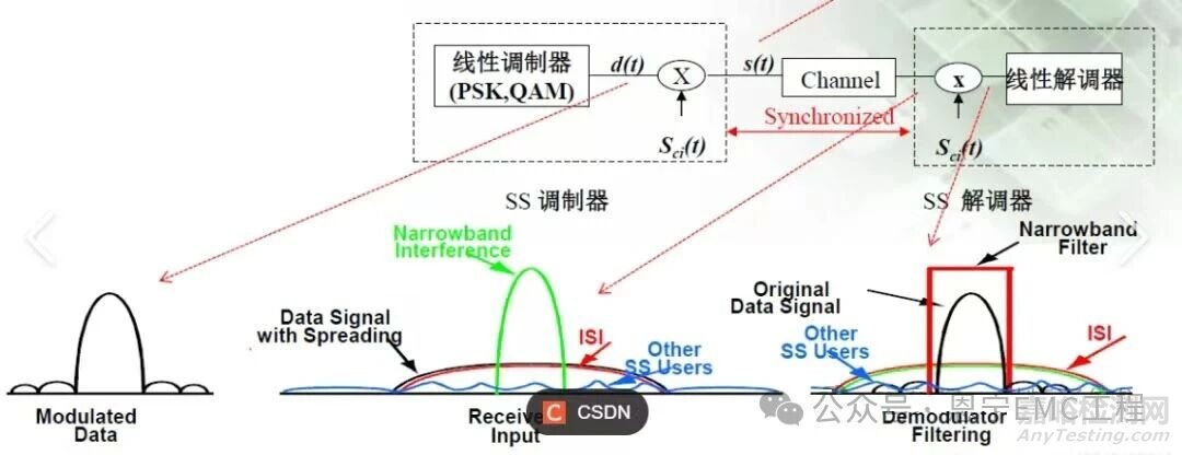 能量擴(kuò)散:能量分散到寬頻段,降低單頻段功率,抗窄帶干擾;