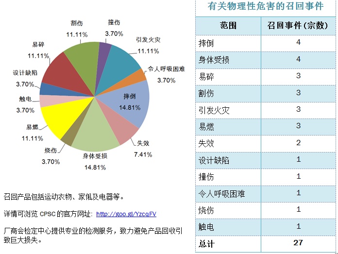 美國(guó)消費(fèi)品安全委員會(huì)(CPSC)是一間獨(dú)立的聯(lián)邦監(jiān)管機(jī)構(gòu),主要保護(hù)廣大消費(fèi)者的利益,通過(guò)減少消費(fèi)品存在的傷害及死亡的風(fēng)險(xiǎn),以維護(hù)人身及家庭安全,例如:因消費(fèi)品所產(chǎn)生的火災(zāi)或漏電等風(fēng)險(xiǎn)。以下的圖表顯示了于2015年5月CPSC涉及物理性危害的召回事件。