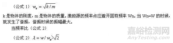 頻率可分為固有頻率Wn和激勵(lì)頻率W,固有頻率源于產(chǎn)品的結(jié)構(gòu)特征,由質(zhì)量、質(zhì)量分布、質(zhì)心位置、剛度等多個(gè)因素和多個(gè)因素間的相互作用所確定。固有頻率計(jì)算公式為(公式1)k是物體的剛度,m是物體的質(zhì)量。激勵(lì)源的頻率點(diǎn)應(yīng)避開固有頻率Wn。當(dāng)Wn=W的時(shí)候,就發(fā)生了諧振,諧振時(shí)候的振幅最大。