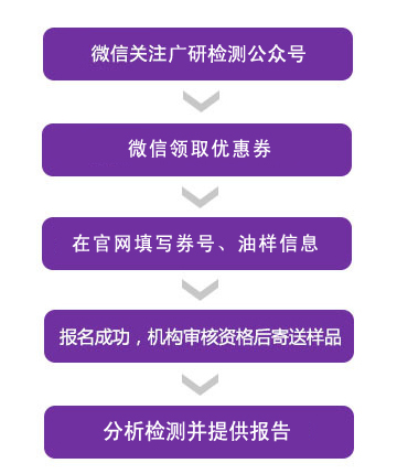 領(lǐng)取方法:關(guān)注廣研檢測(cè)微信公眾號(hào)→主界面菜單→查看更多→免費(fèi)檢測(cè)→領(lǐng)取優(yōu)惠券→將券號(hào)寫入注冊(cè)油樣信息備注欄(在第二步中完成)。