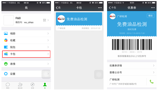 領(lǐng)取方法:關(guān)注廣研檢測(cè)微信公眾號(hào)→主界面菜單→查看更多→免費(fèi)檢測(cè)→領(lǐng)取優(yōu)惠券→完成領(lǐng)取。
