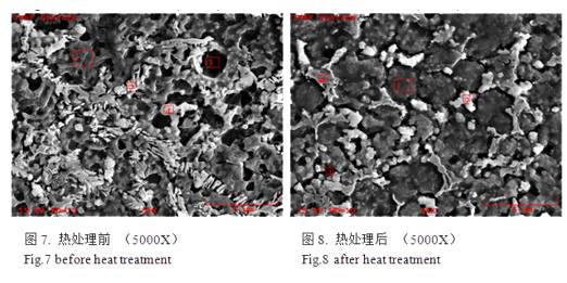 圖7、圖8是在5000X下熱處理前后組織,用EDS探測圖7中熱處理前微區(qū)成分1~4,圖9~12分別是微區(qū)1~4的能譜圖,探測結(jié)果如表2所示。其中的F含量應該是組織腐蝕液中含有HF酸的原因,在表3中不再列出。