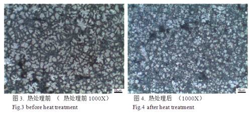 圖3是熱處理前組織,可以觀察到枝晶形態(tài),是鑄造組織。失效分析,結(jié)合相圖[2]分析得出:金相組織為初生的α相(白色)和α相之間(α+β)共析體(黑色)及第二相質(zhì)點。初生相α中析出較多顆粒狀共析組織,說明鑄造冷卻速度較慢。