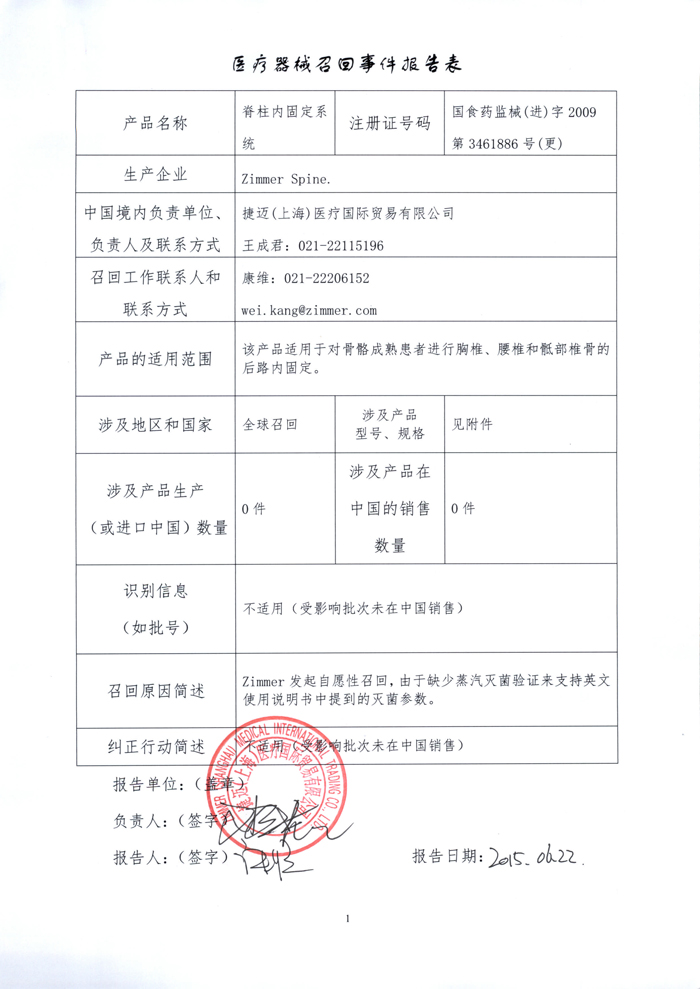 捷邁(上海)醫(yī)療國(guó)際貿(mào)易有限公司報(bào)告,該公司代理的金屬髓內(nèi)釘(商品名:Zimmer Natural Nail) [國(guó)食藥監(jiān)械(進(jìn))字2009第3461886號(hào)(更)],由于產(chǎn)品缺少蒸汽滅菌驗(yàn)證,生產(chǎn)商ZIMMER SPINE公司對(duì)該產(chǎn)品進(jìn)行主動(dòng)召回。該公司稱本次召回產(chǎn)品未在中國(guó)銷售。請(qǐng)各省、自治區(qū)、直轄市食品藥品監(jiān)督管理局加強(qiáng)對(duì)此類產(chǎn)品的監(jiān)督管理。