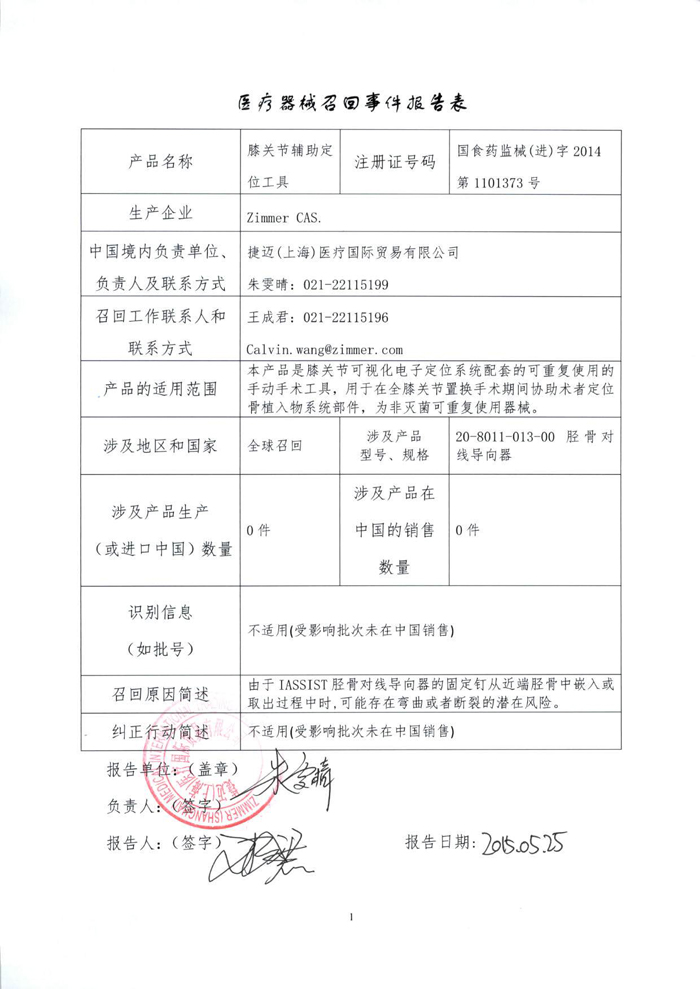 捷邁(上海)醫(yī)療國(guó)際貿(mào)易有限公司報(bào)告,該公司代理的膝關(guān)節(jié)輔助定位工具[注冊(cè)證號(hào):國(guó)食藥監(jiān)械(進(jìn))字2014第1101373號(hào)],由于可能存在彎曲或者斷裂的潛在風(fēng)險(xiǎn),生產(chǎn)商Zimmer CAS.對(duì)該產(chǎn)品進(jìn)行主動(dòng)召回。該公司稱本次召回產(chǎn)品未在中國(guó)銷售。請(qǐng)各省、自治區(qū)、直轄市食品藥品監(jiān)督管理局加強(qiáng)對(duì)此類產(chǎn)品的監(jiān)督管理。