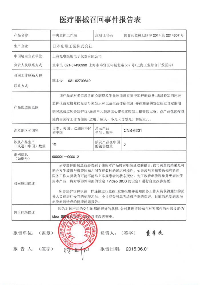 上海光電醫(yī)用電子儀器有限公司報(bào)告:產(chǎn)品存在響應(yīng)延遲,可能導(dǎo)致醫(yī)務(wù)人員不能馬上掌握患者的狀態(tài)變化。日本光電工業(yè)株式會(huì)社主動(dòng)召回相關(guān)產(chǎn)品。召回級(jí)別為II級(jí)。涉及產(chǎn)品的型號(hào)、規(guī)格及批次等詳細(xì)信息見《醫(yī)療器械召回事件報(bào)告表》。