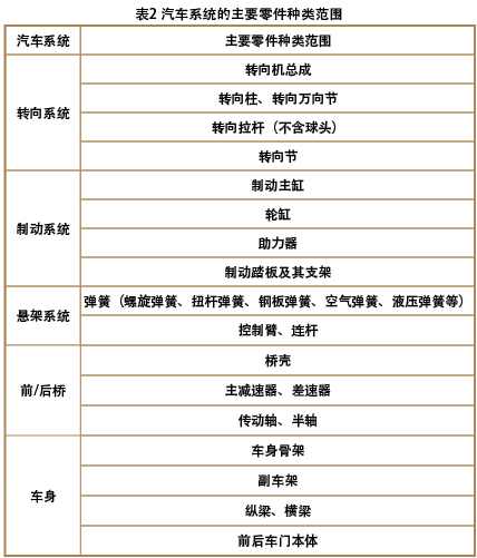 轉(zhuǎn)向系統(tǒng)、制動系統(tǒng)、懸架系統(tǒng)、前/后橋、車身等系統(tǒng)的主要零件由生產(chǎn)者明示在三包憑證上,其種類范圍應(yīng)至少包括表2所列出的內(nèi)容。