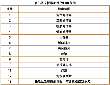 易損耗零部件的種類范圍及其質(zhì)量保證期由生產(chǎn)者明示在三包憑證上。生產(chǎn)者明示易損耗零部件的種類范圍不應(yīng)超出表3所列出的范圍。