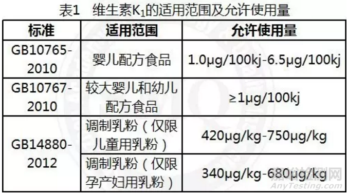 維生素K1現(xiàn)被允許作為營(yíng)養(yǎng)強(qiáng)化劑用于食品及特殊膳食用食品中。GB10765-2010《食品安全國(guó)家標(biāo)準(zhǔn) 嬰兒配方食品》、GB10767-2010《食品安全國(guó)家標(biāo)準(zhǔn) 較大嬰兒和幼兒配方食品》、GB14880-2012《食品安全國(guó)家標(biāo)準(zhǔn) 食品營(yíng)養(yǎng)強(qiáng)化劑使用標(biāo)準(zhǔn)》都對(duì)維生素K1的添加量都作了限量要求,詳情見表1。