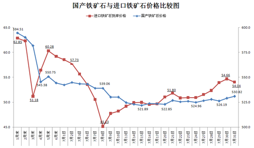 國產(chǎn)鐵精礦呈先跌后漲走勢,全月平均含稅價格為530.21元/噸,比上月下降22.03元/噸,降幅為3.99%。其中:7月1日至15日,由544.34元/噸降至521.89元/噸,跌幅為4.12%;7月15日至7月31日,由521.89元/噸反彈至530.82元/噸,漲幅為1.71%。