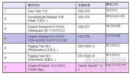 PV3938測試標準:測試條件:23oC、50%RH;測試方法:靜態(tài)測試;采樣方法:使用紅外燈同時照射車內(nèi)不同部位使其表面溫度達到65oC,封閉一定時間后采集車內(nèi)空氣樣品。