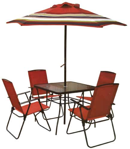 此次被召回的產(chǎn)品名稱為Outdoor Dining Sets,是一款用于戶外的6件套餐桌椅套裝,其中包含有4個折疊椅,一個桌子和一把傘。棕色金屬框椅的座位和靠背為紅色帆布,傘有