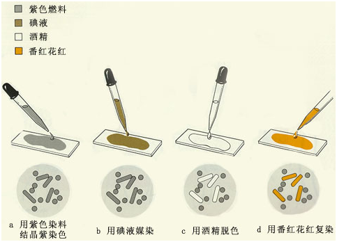在顯微鏡油鏡頭下觀察,菌體顯藍紫色的為革蘭氏陽性菌;菌體顯紅色的為革蘭氏陰性菌。